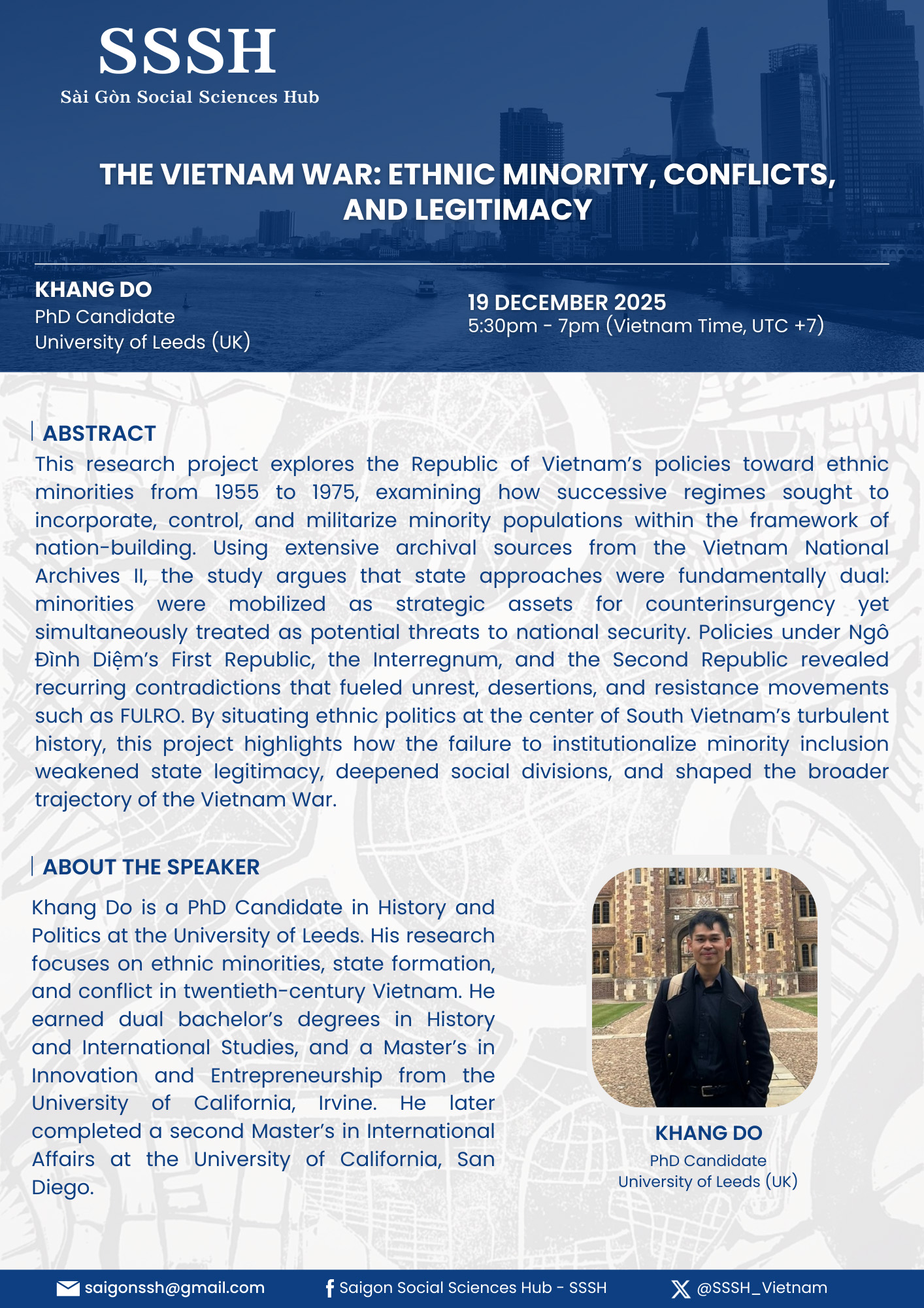 Khang Do, PhD Candidate at University of Leeds (UK), will present his research on the Republic of Vietnam’s policies toward ethnic minorities from 1955 to 1975.
