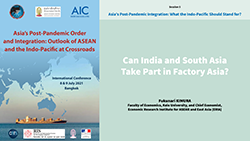 The economic context of Indo-Pacific has not well developed yet due to a currently thin economic relationship between ASEAN/East Asia and India/South Asia in the international division of labor. India and South Asia have not participated in the East Asian task-by-task division of labor centered by (...)