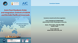 Conclusive session by the three organizers : Prof. Suthiphand Chirathivat, ASEAN Studies Center, Chulalongkorn University ; Assoc. Prof. Claire Thi Lien Tran (IRASEC CNRS), Prof. Prabir De, ASEAN-India Centre (AIC), RIS