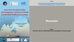 “Asia’s Post-Pandemic Order and Integration : Outlook of ASEAN and the Indo-Pacific at Crossroads” is an international conference organized by The Research Institute on Contemporary Southeast Asia (IRASEC-CNRS) with the ASEAN Studies Center (Chulalongkorn University) in Bangkok, and the ASEAN-India Centre (AIC), RIS in New Delhi.